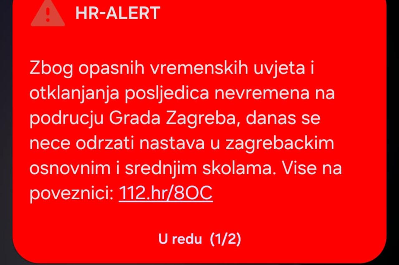 Zbog izvanrednih vremenskih uvjeta, Grad Zagreb i Ministarstvo znanosti, obrazovanja i mladih odlučili su da se danas 27. ožujka 2026. neće održavati nastava u zagrebačkim osnovnim i srednjim školama.