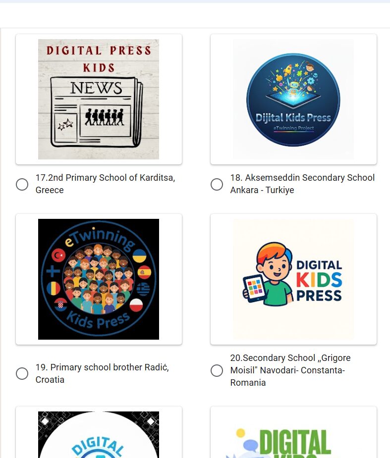 Digital Kids Press je osmomjesečni eTwinning projekt u kojem učenici u dobi od 8 do 15 godina postaju međunarodni urednički tim koji stvara suradnički digitalni časopis na engleskom jeziku. Kroz mjesečne tematske aktivnosti – školski život, kultura, okoliš, umjetnost i zabava – učenici djeluju kao novinari, fotografi i dizajneri. Koriste sigurne Web 2.0 / Web 3.0 i početnicima prilagođene alate umjetne inteligencije za istraživanje, pisanje, dizajniranje i objavljivanje interaktivnog sadržaja.