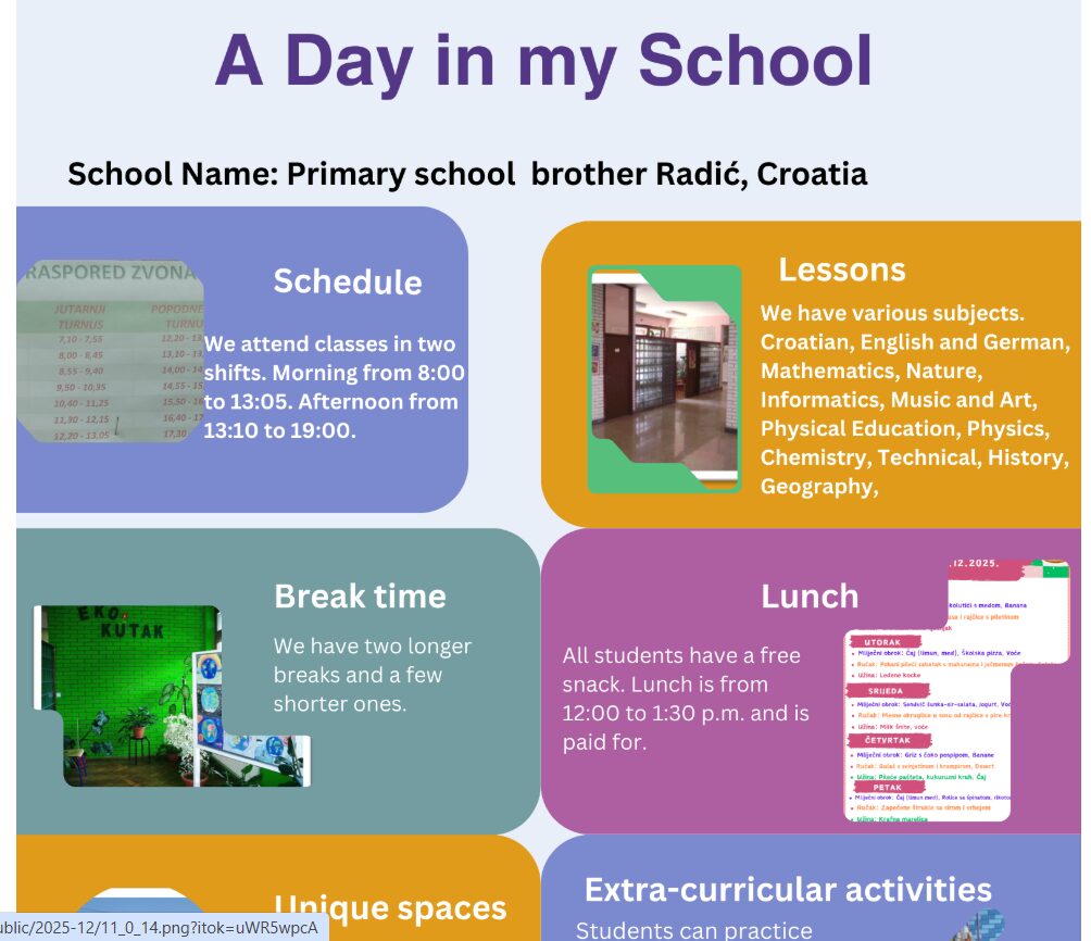 Učenici surađuju kako bi izradili i objavili stranicu digitalnog časopisa u kojoj uspoređuju tipičan školski dan u svojim zemljama. Podijelit će svoje dnevne rutine, predmete i školski život putem fotografija, videozapisa i tekstova, a zatim analizirati sličnosti i razlike među europskim školama.